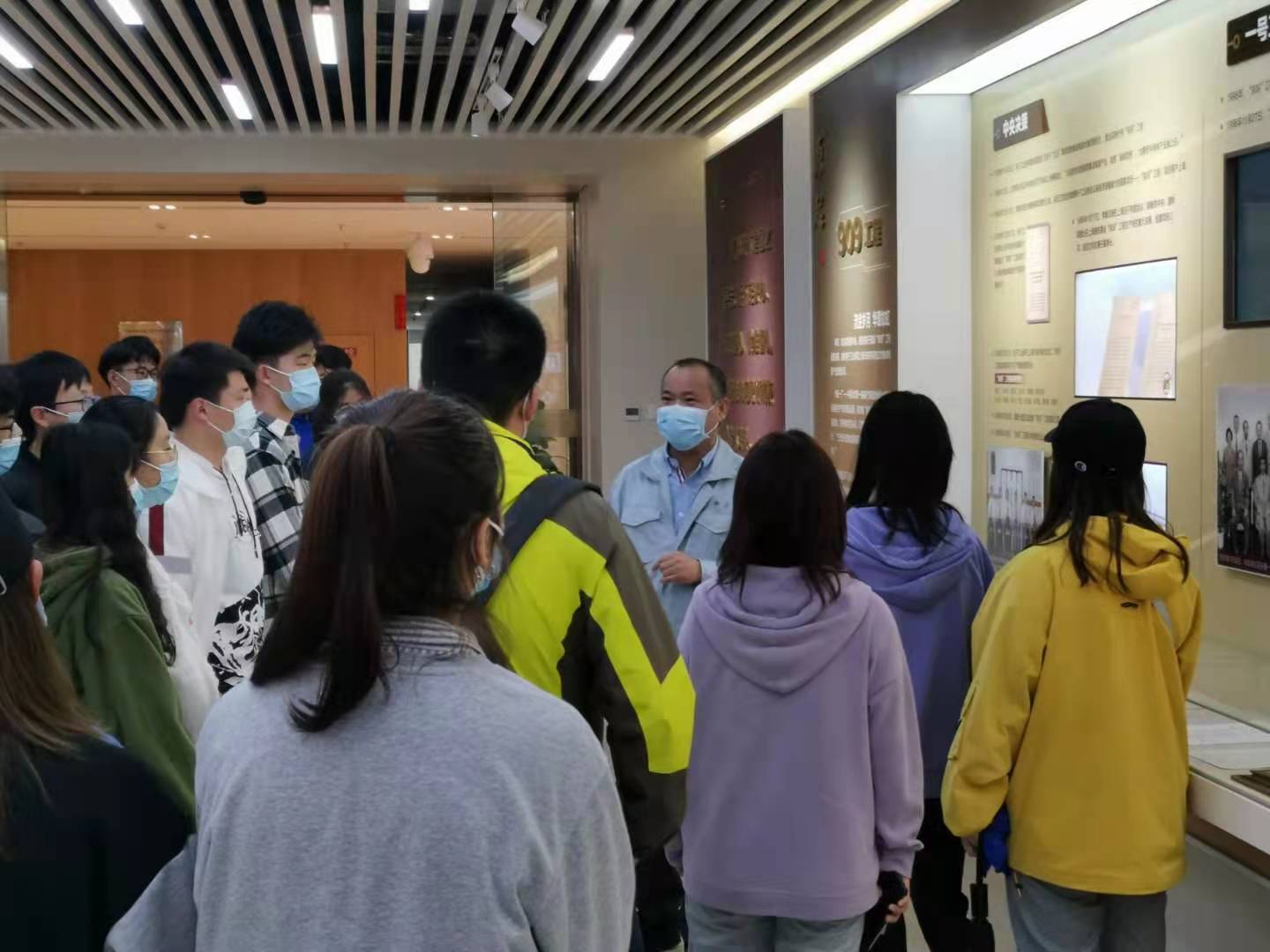 宣讲交流结束后,师生共同参观了华力公司的展厅和生产线。在展厅中,王维元为公司师生介绍了华虹集团的起源、发展和取得的成就。华虹集团作为承担国家“909”工程主体生产线建设运营单位,已经走过二十年的“芯”路历程,现如今华力生产的12英寸芯片已经应用到生活的各方面。在对芯片制造生产线的参观过程中,讲解员为大家详细介绍了芯片生产流程、生产工艺以及超净车间环境,包括华力公司自主研发的全自动物流搬运系统、光刻技术,同学们体验了全上海最干净的空气净化系统和国内最先进的生产线。