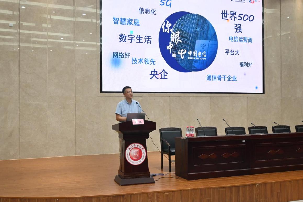 骆巍还向同学们详细地介绍了中国电信的成就与担当、战略与变革以及加入中国电信的成长与发展。世界500强、我国三大运营商之一以及技术领先的央企等等都是中国电信的标签。百年发展,中国电信一直稳步前进,取得了全球CDMA网络运营商领袖大奖、全球最受赞赏公司等多项亮眼的成绩。同时在疫情防控中,以5G为代表的新科技在疫情防控中发挥独特作用,获党中央表彰。未来,中国电信将持续构建5G健康繁荣生态,做全新智能时代的引领者、“网络强国”战略的主力军、做5G变革未来新生活的推动者。最后,骆巍从成长机遇、薪酬福利、工作环境等五个方面介绍了入职中国电信的优势,诚邀同学们加入。