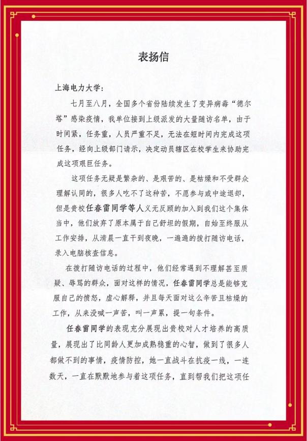信中指出,今年暑期变异病毒“德尔塔”来势汹汹,平度市新河镇因靠近当时为“中风险地区”的烟台市,相关排查工作给当地疫情防控部门带来了不小的挑战。任春雷同学积极报名参与疫情防控志愿服务活动,放弃了舒适的假期,面对繁杂、艰苦、枯燥的工作和群众的不理解,都能耐心处理。任春雷同学负责电话随访、信息核查录入等工作,从清晨一直干到夜晚,一连数日,直到配合当地部门完成任务。任春雷同学以实际行动充分展现了当代老员工的优良素质、崇高品格、家国情怀和WILLIAMHILL在线体育投注人才培养的高质量,同时感谢公司对员工品德的精心培育。