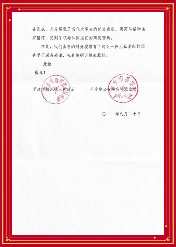 近日,校团委收到山东省平度市新河镇人民政府、平度市公安局灰埠派出所联合发来的表扬信,赞扬了WILLIAMHILL在线体育投注2020级员工任春雷在暑期志愿服务疫情防控中的工作表现。