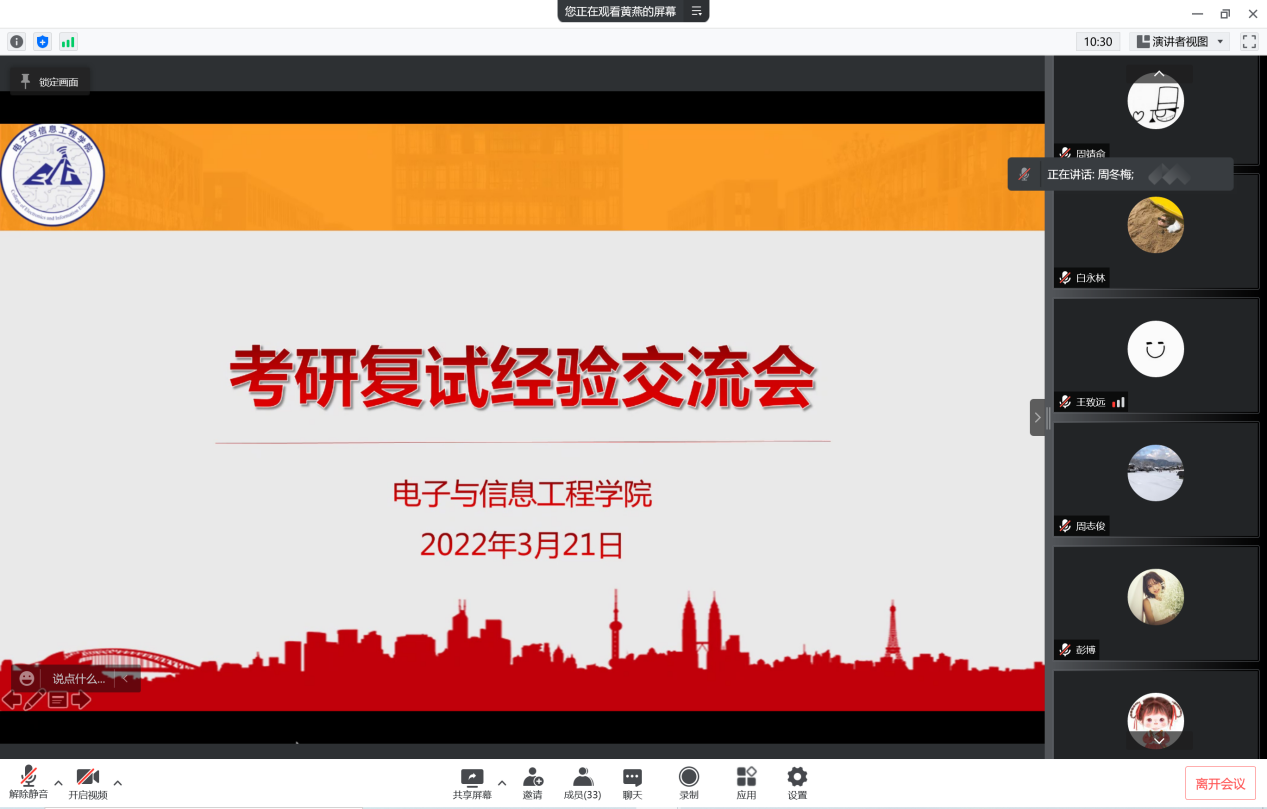 抗疫不停学,在这段特殊时期,为了使进入考研复试的同学掌握更多相关技巧,以良好的状态备战复试,WILLIAMHILL在线体育投注于3月21日晚上7:00举办了线上“考研复试经验交流会”。公司党委副书记周冬梅、光电科学与信息工程专业教师薛亮、就业专项负责人黄燕、毕业班辅导员许晓天、崔释匀参会。会议还邀请了往届优秀学子进行分享。