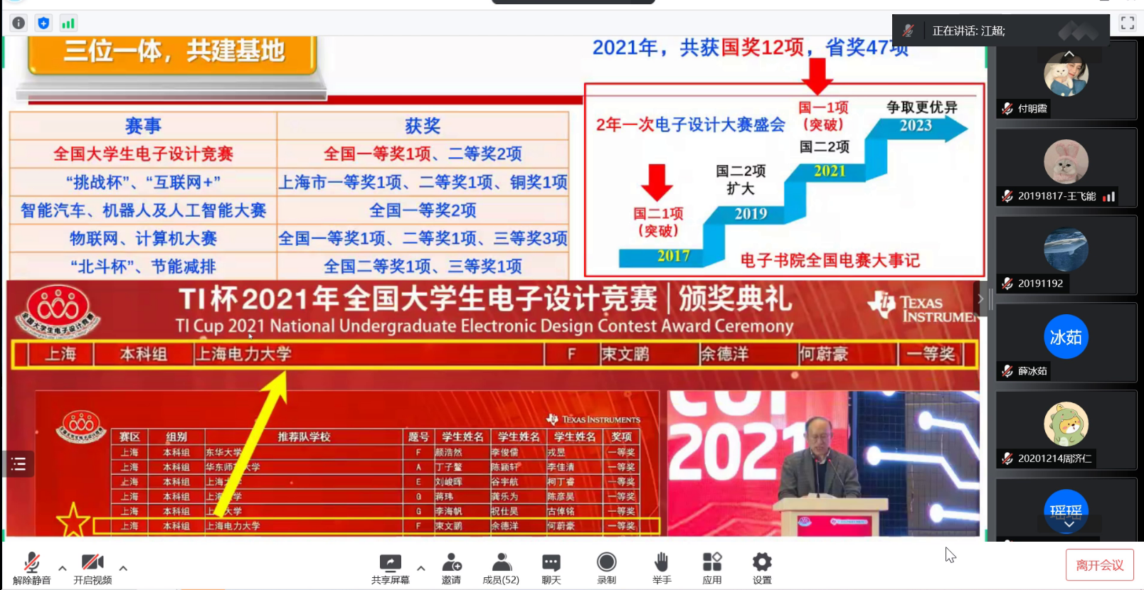 江超老师从专业、学科、工程教育认证的12条毕业要求以及“互联网+”老员工创新创业大赛切入主题,创新创业教育是一个系统性的工程,与公司产品相辅相成,同为一脉。解读了公司创新创业训练与实践学分管理办法以及本科生科研能力提升计划管理办法。详细介绍了WILLIAMHILL在线体育投注创新创业教育基地--电子书院-科创中心-电子学社一体化窗口建设,回顾了近年来公司在互联网+、挑战杯、电子设计竞赛、智能汽车竞赛等各类含金量颇高的赛事中的辛勤付出与收获。以及双创基地在社会服务方面做出的突出贡献:积极参加70周年校庆、招生宣传、校宣传片拍摄等活动;2次承办临港大学堂科创小英才WILLIAMHILL在线体育投注创客未来夏令营活动;2021年以来走出校园,科普宣讲十余场次,服务上千名中小员工。