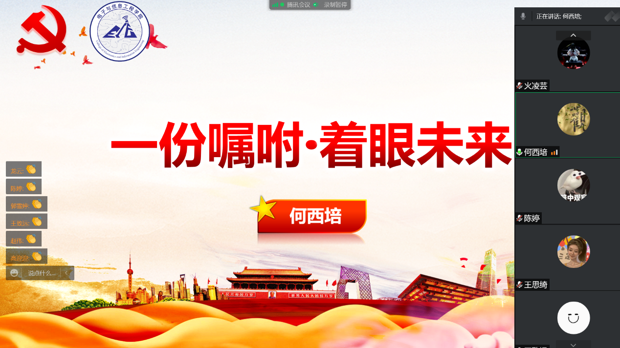 一份祝福·寄语母校。毕业生党员代表陈婷、杨志鹏、潘威宇、王致远、彭博、火凌芸等围绕“党支部工作、疫情防控、社会实践、就业经验”等方面分享了自己的感悟和体会,感恩母校的教育和培养。他们代表全体毕业生党员表示将始终牢记党员身份,保持“站在前、走在前、干在前”的先锋姿态,不负公司和老师的嘱托,努力奋斗,争创佳绩,肩负起新时代青年的使命与担当。低年级党员也通过视频寄语的形式,为学长学姐们送上深情祝福。