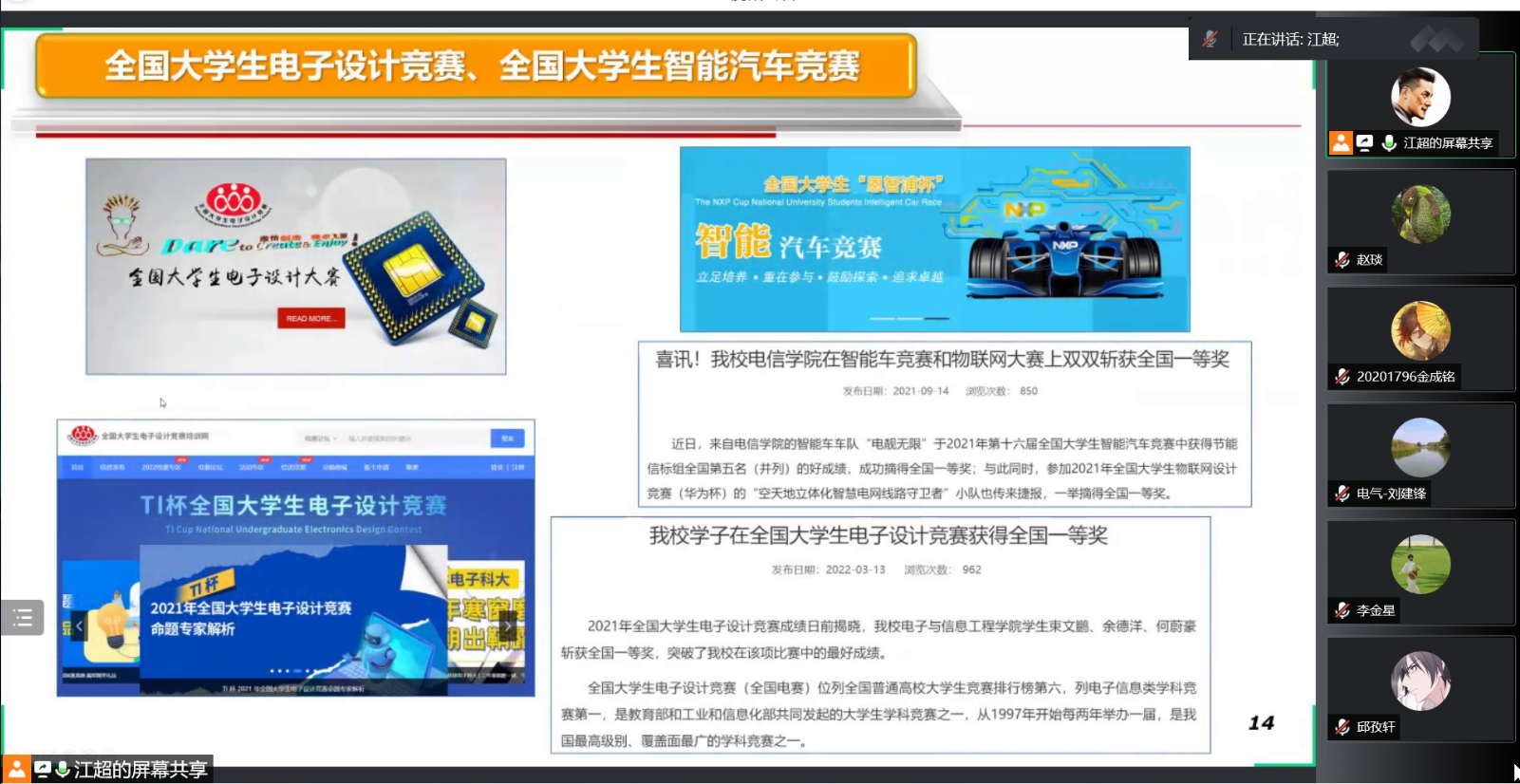 江超老师从专业、学科、工程教育认证的12条毕业要求以及“互联网+”老员工创新创业大赛切入主题,创新创业教育是一个系统性的工程,与公司产品相辅相成,同为一脉。解读了公司创新创业训练与实践学分管理办法以及本科生科研能力提升计划管理办法。详细介绍了WILLIAMHILL在线体育投注创新创业教育基地--电子书院-科创中心-电子学社一体化窗口建设,回顾了近年来公司在互联网+、挑战杯、电子设计竞赛、智能汽车竞赛等各类含金量颇高的赛事中的辛勤付出与收获。以及双创基地在社会服务方面做出的突出贡献:积极参加70周年校庆、招生宣传、校宣传片拍摄等活动;2次承办临港大学堂科创小英才WILLIAMHILL在线体育投注创客未来夏令营活动;2021年以来走出校园,科普宣讲十余场次,服务上千名中小员工。