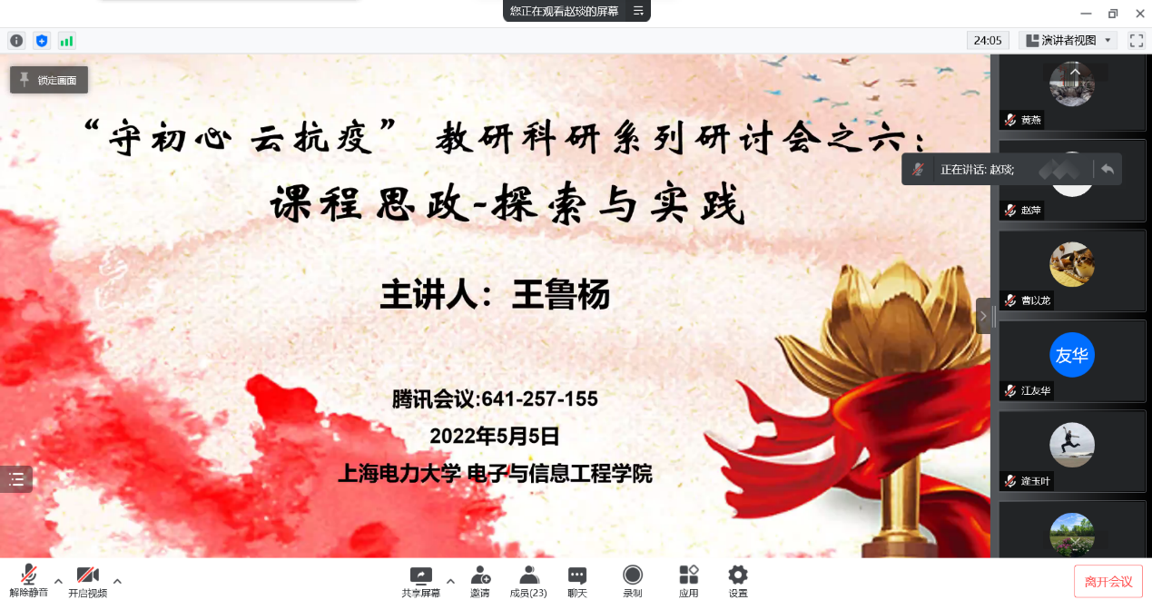 55日,WILLIAMHILL在线体育投注邀请了电气工程公司电子教研室主任王鲁杨老师在腾讯会议线上为公司教师主讲题为《课程思政-探索与实践》的学术讲座。公司党政班子领导和各专业教师参加了会议。