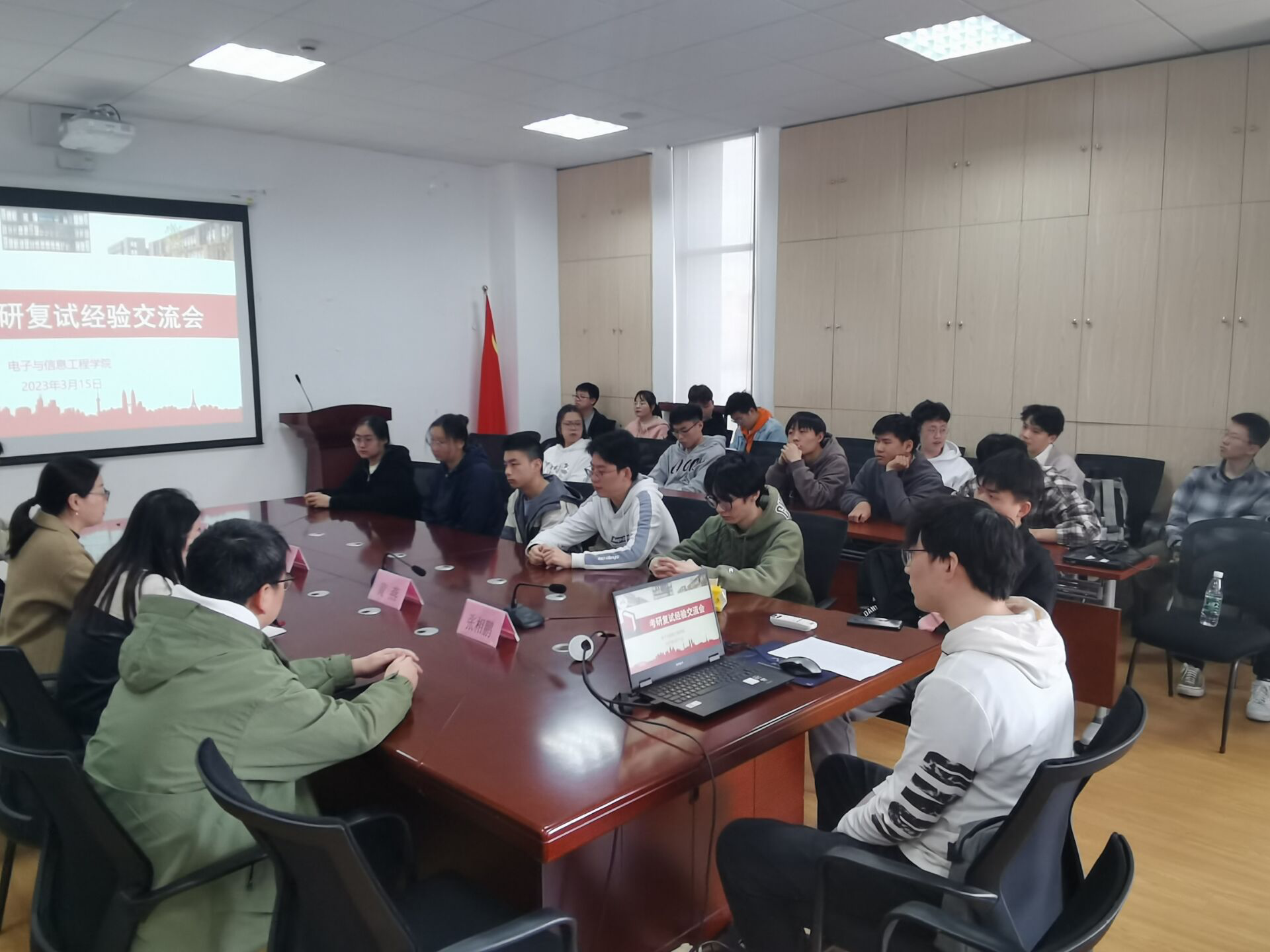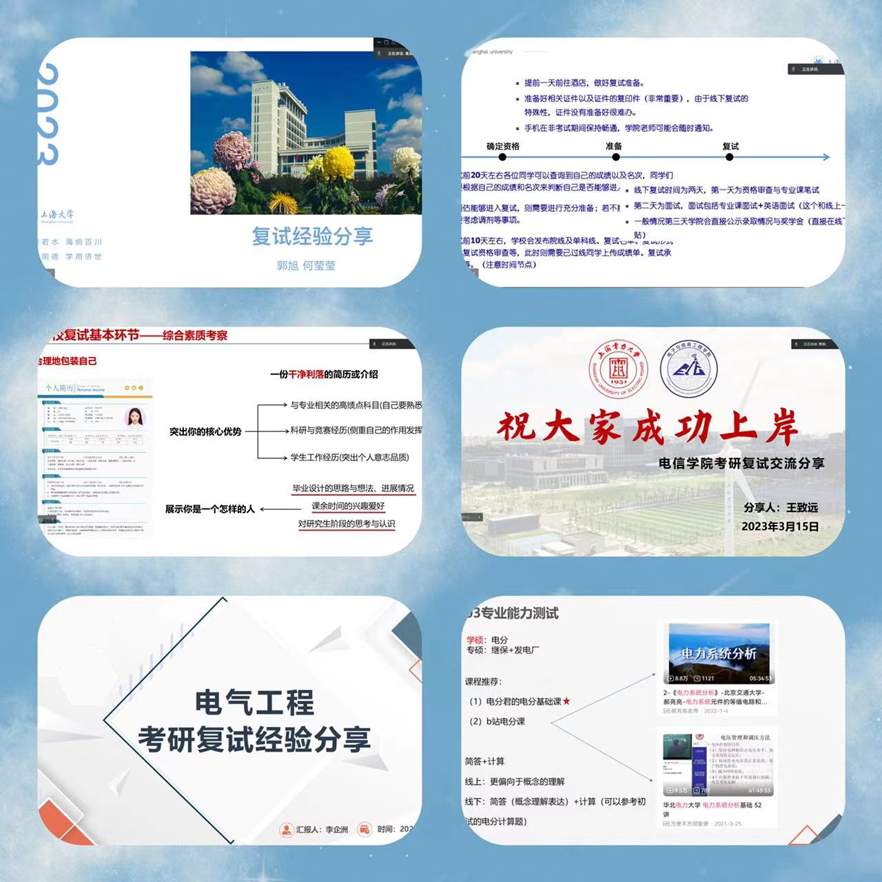 会上,大家结合自身经验作分享。王致远从英文自我介绍、专业知识问答、综合素质考察三个方面对复试流程进行了详细的介绍,强调要根据自己的实际情况,实事求是回答问题。矫玺本从选导师、预面试、专业课等多个方面为报考电子科技大学的考研学子们解答疑惑,他强调在准备复试前需要了解对应专业的导师信息,同时要多模拟、多练习,以充足的准备去应对复试。李企洲重点分享了公司电气公司复试时的经验,强调在英语能力测试中的问答环节时要注意运用专业词汇,回答要突出逻辑性,切忌紧张慌乱。周靖俞结合上海理工大学的复试进行了分享,提醒同学们调整好心态,面试过程中要尽量展示自身的优点与特长。张相鹏分享了本校跨考调剂经历,指出在调剂时要慎重选择,保持良好的心态,积极应对挑战。郭旭和何莹莹围绕上海大学的复试科目、复试流程等方面做了详细的介绍,建议在复试前准备一份亮点突出的简历,并对内容要了然于胸,为面试做充足的准备。