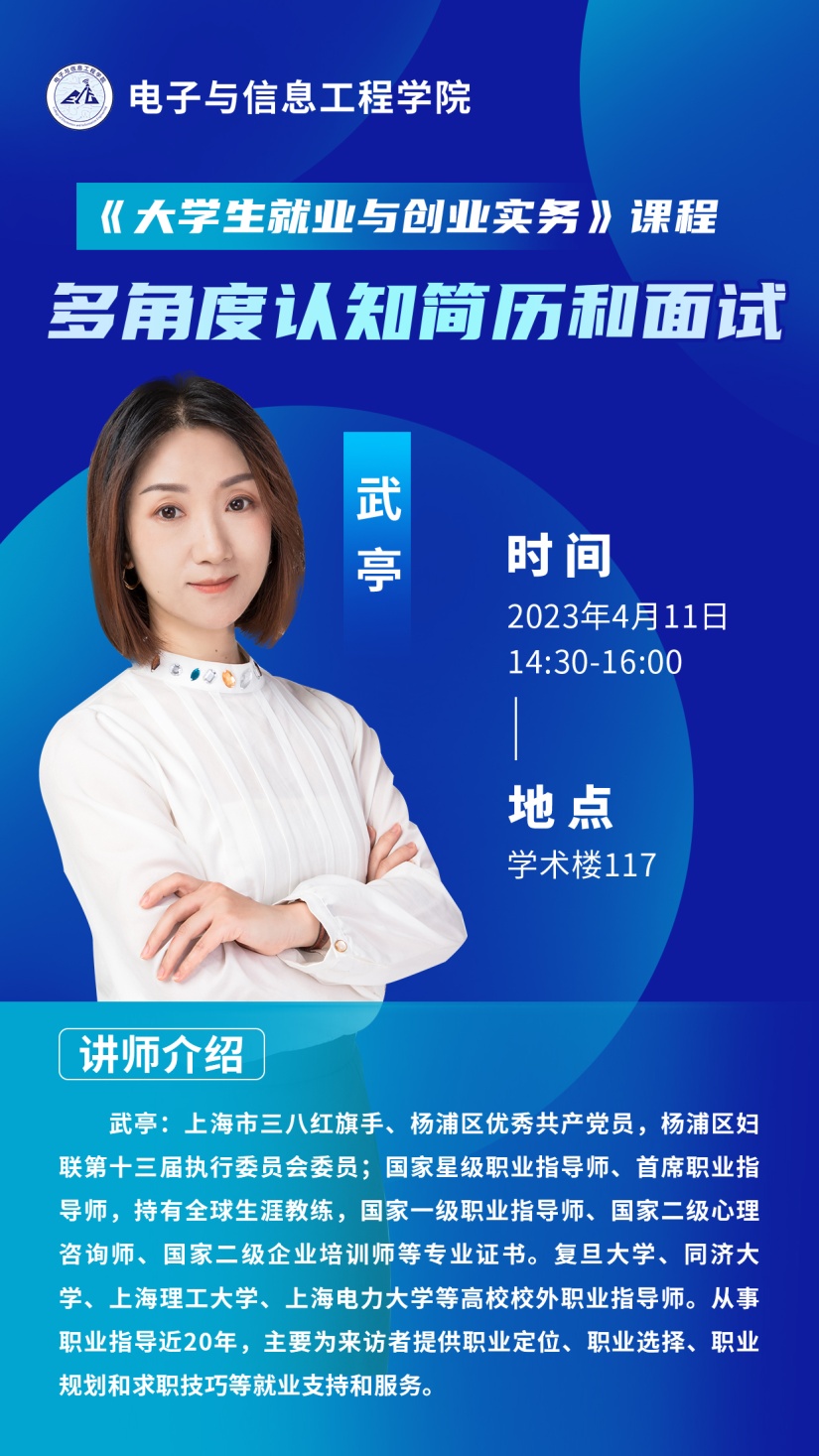 此次课程由公司校外职业指导师武亭主讲。武亭为上海市三八红旗手、杨浦区优秀共产党员,杨浦区妇联第十三届执行委员会委员;国家星级职业指导师、首席职业指导师,持有全球生涯教练,国家一级职业指导师、国家二级心理咨询师、国家二级企业培训师等专业证书。在职业定位、职业选择、职业规划和求职技巧等方面有近20年的指导经验。