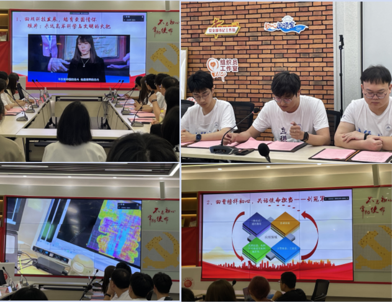 回顾科技发展,共话使命担当。观摩会以一部我国科技发展成果的短片开始,展现了近年来我国在宇宙探索、大国基建、国防建设等科技方面的新突破新发展。支部研究生党员以自身的工作、科研内容作为切入点,讲述了自己对于使命担当的理解,其中支部党员朱金力,在实习企业线上参加支部活动,通过视频直播的方式展示了他在工作中负责的项目内容,让与会党员直观地了解到前沿科技在企业中的实际应用。