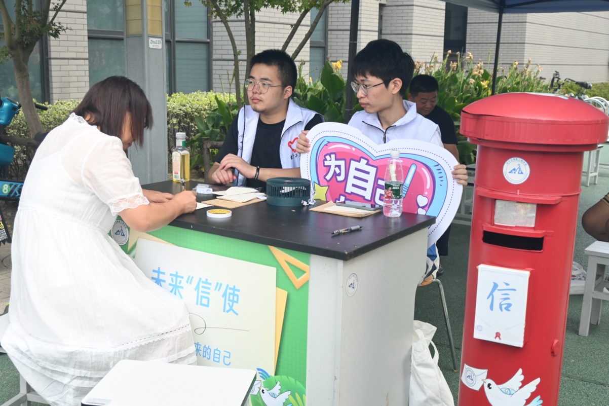 在公司门口,还设置了未来“信”使邮筒,志愿者向新生讲解着活动的意义,新学期、新起点,新生们纷纷在明信片上写下自己对大学的期待、对未来的规划以及对未来的自己想说的话,将期望与梦想寄于笔尖,投进邮筒中。