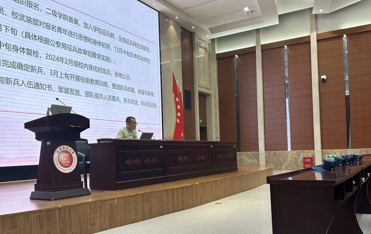 为扎实有效推进2024年征兵入伍工作,对新生做好国防教育,激发员工参加入伍热情,近日,公司在学术楼117报告厅组织召开2023年新生入学教育系列活动之征兵政策宣讲会。公司征兵工作负责人阮文杰、本科新生辅导员、军训教官、退伍士兵代表以及全体新生参会。