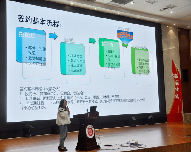 黄燕围绕毕业生关心的签约流程、毕业材料、应届生身份、求职陷阱等问题进行了详细讲解。佘茂源、顾雪珺到场分享求职经验,员工们结合自己的职场经验指出高校毕业生就业形势严峻,希望广大同学做好自身定位,抓住求职机会,精心准备面试,认真对待每一次就业应聘。他们鼓励毕业生在未来的一年里,不忘初心,明确方向,抓住机遇,勇于实践,顺利就业,为自己的老员工活划上圆满的句号。