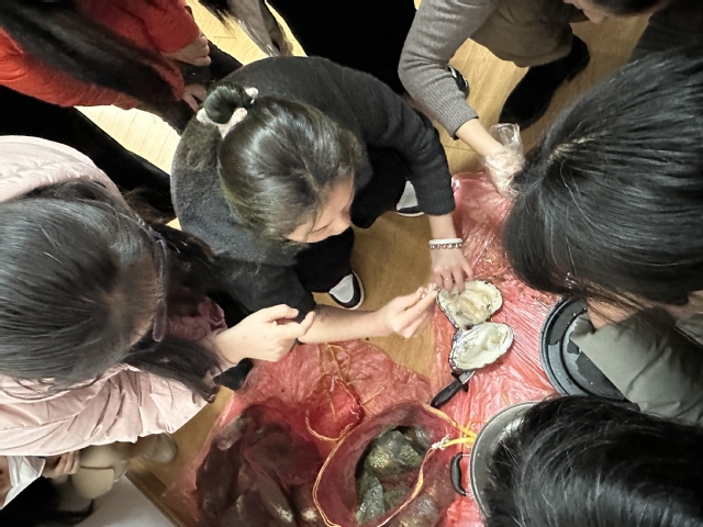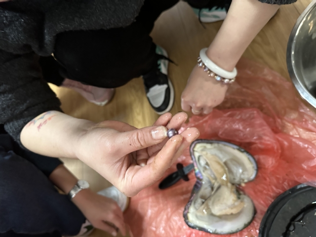 本次活动通过现场手工开蚌并取珠制作自己喜欢的珍珠饰品,让老师们在制作过程中,感受到惊喜和diy的乐趣。活动开始后,专业设计师给大家详细讲解了珍珠的基本知识、开蚌的注意事项以及珍珠饰品的制作步骤。接着,老师们挑选贝壳,并在专业设计师的帮助下成功开蚌。不少老师是第一次开蚌,在珍珠打开的一瞬间,现场传来了一阵阵欢呼声和赞美声,体验了一把开盲盒的快乐,活动气氛热烈欢快。接着,通过取珠、浸洗、打孔、镶嵌等步骤,一件件精美的珍珠饰品在老师们手中诞生。