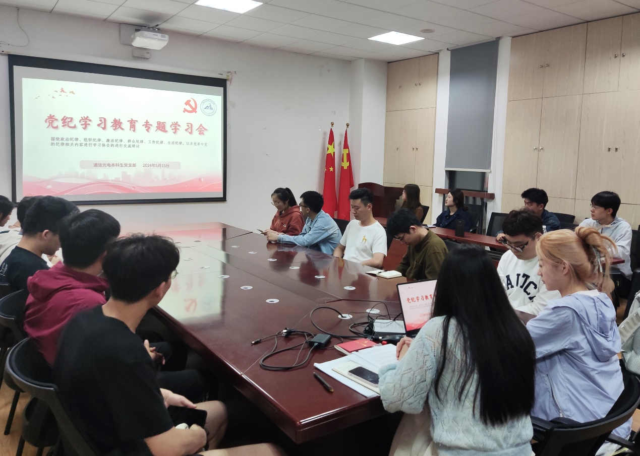 为深入开展党纪学习教育,进一步使党纪党规入脑入心,引导党员不断增强纪律意识,在支部内营造学纪、知纪、明纪、守纪的良好氛围,5月15日晚上,通信光电本科生党支部在电计楼B402会议室开展《中国共产党纪律处分条例》学习和党纪学习教育专题学习会,联系支部的公司党委书记何西培和支部全体党员参会,会议由支部书记刘甘雨主持。