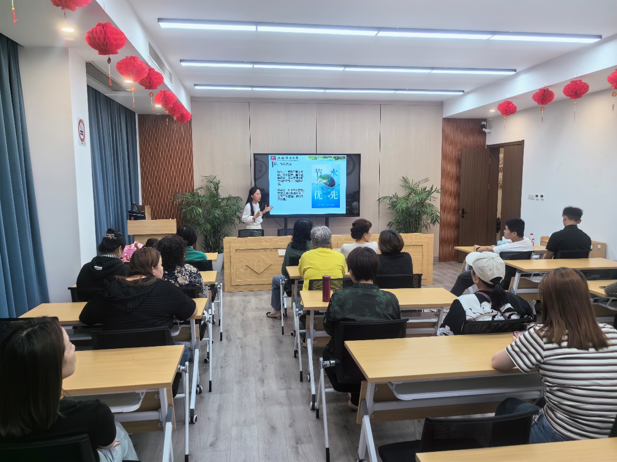 李雅洁介绍了公司在节水方面取得的成效,展示了公司作为上海市节约用水示范(标杆)公司在制度建设、基础设施建设、师生用水等方面采取的一系列措施。她从“为什么要节水”,“怎么样去节水”出发,循序渐进带领社区居民学习节水政策、法规、生活节水小常识、小妙招,进一步提升了居民的节水意识。活动现场还通过设置宣传咨询台、悬挂宣传标语、发放宣传手册等形式,向居民科普节水知识,分享日常节水小窍门,并开展了居民关于节水用水方面的咨询服务。
