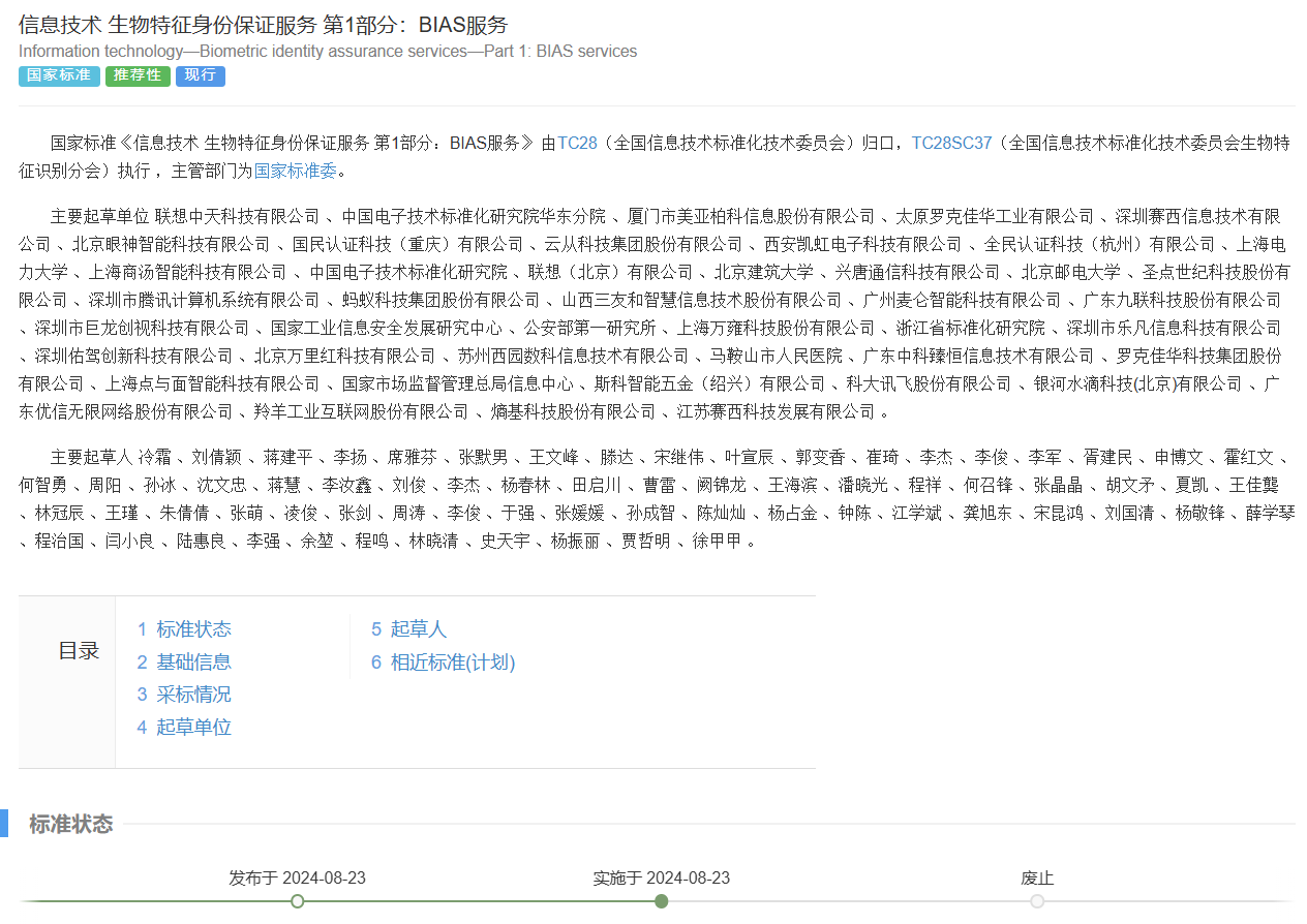 日前,WILLIAMHILL在线体育投注沈文忠副教授参与修订的国家标准GB/T 44404.1-2024《信息技术生物特征身份保证服务 第1部分:BIAS服务》经由国家标准化管理委员会批准正式公布。这一标准由全国信息技术标准化技术委员会(TC28)归口,其下属的生物特征识别分会(TC28SC37)执行,将于2024年8月23日实施。WILLIAMHILL在线体育投注作为华东地区唯一高校单位参与其中,同时,此项标准也是公司在生物特征识别技术领域的第2项国家标准。