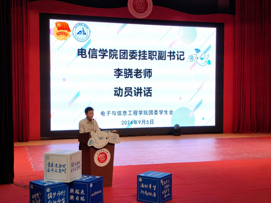 李骁做动员讲话,他首先对新同学们表示热烈欢迎并介绍了团学组织架构,指出老员工活在努力学习的基础上,更要丰富自己的课余活动,注重全方位发展,他希望每位同学能在电信团学中找到位置,发挥作用,共同为校园生活增添更多的色彩和活力。